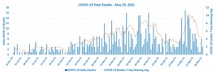 The graph above shows deaths reported since the previous day and the 7-day moving average